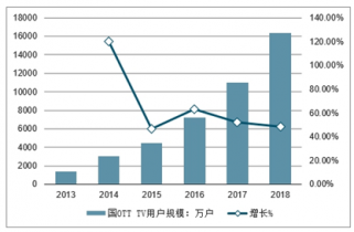 2013-2018年中國OTT TV用戶規模及增長走勢