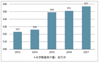 2013-2017年中國光學眼鏡架產量從5.23億件增長到5.57億件,中國光學眼鏡架的產值從178億元增長到208億元,復合年增長率為4.0%。2014-2019年增長率較低,是由于歐洲國家經濟下滑導致出口值下降。伴隨著歐洲快速城市化及預期經濟復蘇將推動中國光學眼鏡架生產的增長。