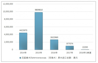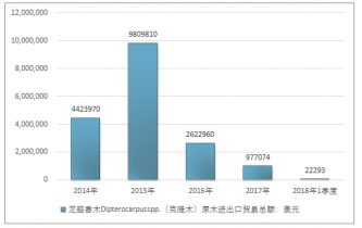 2016年我國龍腦香木Dipterocarpusspp.(克隆木)原木進口總額2622960美元,2017年進口總額977074美元;2018年1季度進口總額22293美元。