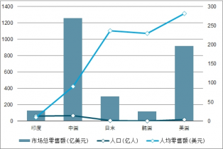 2019年全球主要國家家電零售額規(guī)模、人口、人均零售額對比