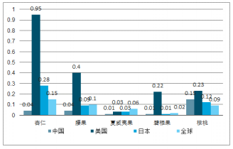 全球及主要經濟體人均堅果消費量對比(單位:克)