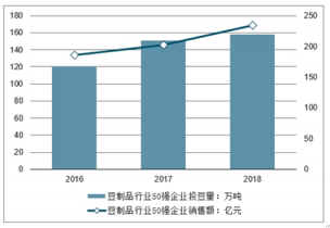 2016-2018年中國豆制品行業50強企業投豆量及銷售額情況