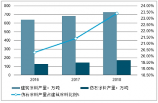 2016-2018年中國仿石涂料產量及占建筑涂料產量比例情況