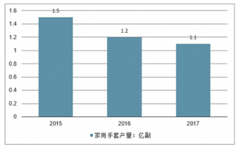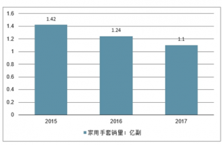 2016年我國家用手套業消費量到1.24億副, 2017年達到家用手套業消費量1.21億副,比2016年減少0.03億副。