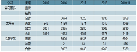2019年上半年,休閑服飾行業(yè)公司中太平鳥和拉夏貝爾渠道均出現(xiàn)下滑拉夏貝爾因為渠道集中在百貨,在進(jìn)行渠道的轉(zhuǎn)型調(diào)整,公司主動實施了戰(zhàn)略性收縮策略,持續(xù)優(yōu)化線下直營渠道,關(guān)閉低效、虧損零售網(wǎng)點以減少資源的無效投入,太平鳥直營終端增長比例較高,加盟終端數(shù)量有所下降,主要因為太平鳥公司在2019年上半年對經(jīng)銷商門店進(jìn)行了主動調(diào)整,提升終端門店的質(zhì)量,并且經(jīng)銷商開店主要集中在下半年,上半年一般處于凈關(guān)店狀態(tài)。太平鳥報表同店出現(xiàn)較大程度下滑,主要因為2019年一季度春節(jié)提前導(dǎo)致旺季銷售時間縮短,且氣候偏暖高客單價服裝(羽絨服等)銷售減少,因此2019年一季度可比同店下降幅度較大,2019年二季度以來,公司可比同店下降幅度已經(jīng)在收窄。
