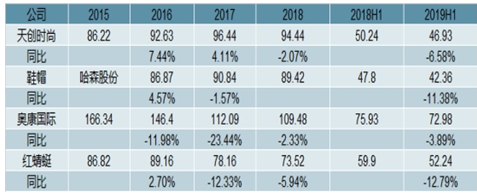 鞋帽行業(yè)2019上半年實(shí)現(xiàn)營(yíng)收43.0億元,實(shí)現(xiàn)凈利潤(rùn)2.7億元,同比下降33.1%。鞋帽行業(yè)近年表現(xiàn)持續(xù)偏弱,主要由于相關(guān)上市公司主業(yè)均以皮鞋為主,但近年流行趨勢(shì)是運(yùn)動(dòng)鞋和休閑鞋,皮鞋消費(fèi)持續(xù)低迷。