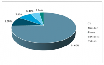 TV應(yīng)用主導(dǎo)LCD面積需求。按照面積口徑,由于2017年LCD需求占整個FPD面積需求97%,基本可以用LCD下游需求來分析整個FPD的下游需求。2017年12月數(shù)據(jù),全球LCD下游需求主要由TV、Monitor、手機和NB構(gòu)成,分別占比74.6%、9.8%、7.8%、5.4%,可以看出TV市場占據(jù)FPD最重要的面積需求。