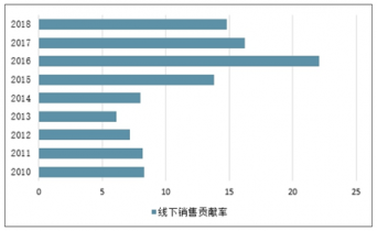 2010-2018年中國寵物食品線下銷售貢獻率增長