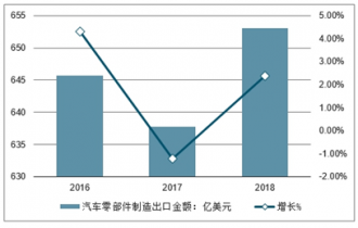 2016-2018年中國汽車零部件制造行業(yè)出口金額及增長(單位:億美元,%)