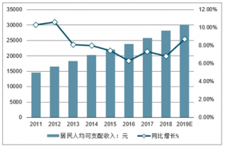 2011-2019年中國居民人均可支配收入及同比增長走勢