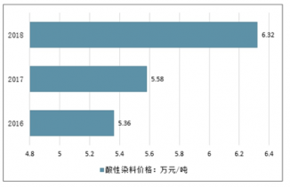 酸性染料是指在染料分子中含有酸性基團,又稱陰離子染料,能與蛋白質纖維分子中的氨基以離子鍵相結合,在酸性、弱酸或中性條件下適用。主要為偶氮和蒽醌結構,少數是芳甲烷結構。染料和顏色一般都是自身有顏色,并能以分子狀態或分散狀態使其他物質獲得鮮明和牢固色澤的化合物國內酸性染料平均價格整體呈現上漲態勢,從2013年的4.55萬元/噸增長到2019年的6.32萬元/噸。