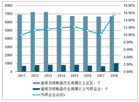 2011-2018年中國(guó)造紙及紙制品行業(yè)規(guī)模以上企業(yè)、虧損企業(yè)數(shù)量統(tǒng)計(jì)及增長(zhǎng)情況