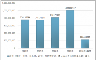 2016年我國櫟木(橡木)木材,經縱鋸、縱切、刨切或旋切,厚>6mm進出口貿易總額812172993美元,2017年進出口貿易總額1002288747美元;2018年1季度進出口貿易總額228406898美元。