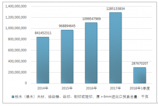 2016年我國櫟木(橡木)木材,經縱鋸、縱切、刨切或旋切,厚>6mm進出口貿易總量1099547969千克,2017年進出口貿易總量1285133834千克;2018年1季度進出口貿易總量287670207千克。