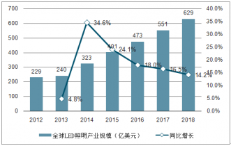 在全球節能環保理念的貫徹和各國行業政策的扶持下,近幾年全球LED照明市場總體依然保持10%以上速度增長,2018年全球LED照明產業規模為629億美元,同比增長14.2%。不過相比較前幾年,增速放緩,主要原因來自LED照明產品終端價格的下滑以及市場需換裝的存量下降。