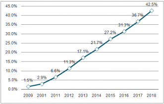 2009-2018年全球LED照明行業滲透率情況(單位:%)