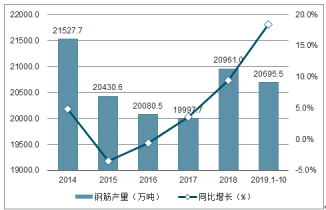 10月中國鋼筋產量為2206.7萬噸,同比增長11.9%;2019年1-10月中國鋼筋產量為20695.5萬噸,同比增長18.4%。