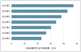 2019年中國(guó)電動(dòng)窗簾行業(yè)市場(chǎng)規(guī)模達(dá)到22.91億元,預(yù)計(jì)到2025年中國(guó)電動(dòng)窗簾行業(yè)市場(chǎng)規(guī)模將達(dá)到47.42億元。