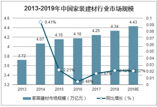 我國建材家裝市場經過20多年的發展于2014年突破4萬億元,并保持穩定增長態勢。2018年我國家裝建材市場規模達到4.34萬億元,而到2019年的市場規模將進一步增長至4.43萬億元。