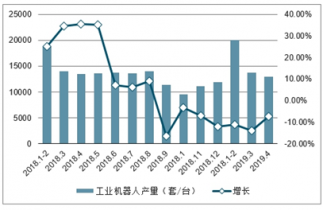 近年,隨著人口紅利消逝,我國加速推進工業機器人應用,以解決勞動力問題。并且隨著工業制造想著智能制造的方向發展,“機器換人”成為趨勢;綜合上述原因,工業機器人的產量應該會保持較高增速,但國家統計局的數據顯示,2019年我國工業機器人產量走出了持續多年的“高增長”并迅速轉為負增長。這一趨勢甚至延續至2019年,一季度產量累計同比為-11.70%,最新的4月份數數表現持續走低,產量累計同比為-10.2%。