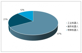 中國機器人市場保持高速增長,行業進入成長期,國內機器人銷售額年平均增長率保持在20%以上,預計未來仍保持25%左右的市場增長率,2019年市場規模將突破百億美元。然而中國工業機器人密度遠低于主要發達國家,2017年中國機器人密度為68臺/萬人,略低于世界平均值74臺/萬人,僅為韓國的11%,新加坡的14%,德國的22%,具有廣闊的市場空間。機器人分為工業機器人、服務機器人和特種機器人。其中工業機器人市場比重最大,占據三分之二的市場份額。