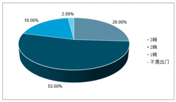 根據旅游統計,國內旅游平均停留時間為3天,連續3晚愿意體驗夜游的受訪者達到26%,選擇2晚的受訪者占到53%,不愿出游的受訪者僅占2%,人均夜游停留時間為2.03晚。說明未來一段時間內,游客夜游意愿強烈,夜游市場需求廣闊,隨著夜游產品的豐富多元和夜游環境的日臻完善,未來夜游需求將持續旺盛,市場潛力巨大。