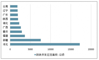 全國鋼鐵開發區中河北省的鋼鐵開發區面積最大,達1.72萬公頃,是唯一合計面積超10000公頃的省市。第二為新疆面積達7567.65公頃;第三是福建省鋼鐵開發區面積為3631.78公頃;重慶、廣西、湖北鋼鐵開發區面積分別為2881.06公頃、2640.93公頃、2230.32公頃。