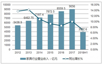 2012-2018年上半年中國家具行業(yè)營業(yè)收入及增長走勢