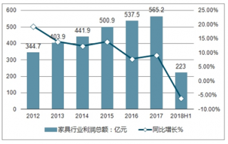2017年全年家具行業(yè)實現(xiàn)利潤總額達到565.2億元,同比增長9.3%,與上年相比增長1.4個百分點。到2018上半年全國家具行業(yè)利潤總額達223億元,相比去年同期下降6.1%。
