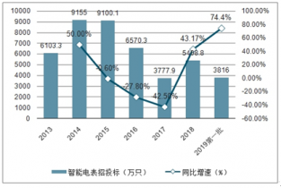 2013-2019年國家電網(wǎng)智能電表招投標(biāo)及增長情況(單位:萬只,%)