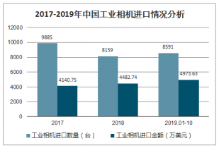 2017-2019年中國工業相機進口情況整體有所好轉,進口工業相機數量雖然增加不多,但是進口金額呈現較大幅度上升,2018年中國工業相機進口數量為8159臺,進口金額為4482.74萬元,2019年1-10月份進口數量和進口金額都已經超過2018年全年。