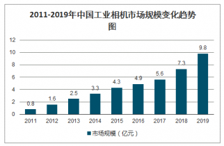 工業智能相機并不是一臺簡單的相機,而是一種高度集成化的微小型機器視覺系統。它將圖像的采集、處理與通信功能集成于單一相機內,從而提供了具有多功能、模塊化、高可靠性、易于實現的機器視覺解決方案。2011-2018年中國工業相機市場規模呈現穩定上升趨勢,2018年中國工業相機市場規模大致在7.3億元,2019年達到9.8億元。