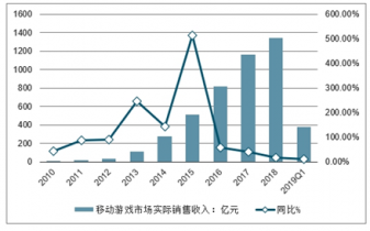 2010-2019年Q1中國(guó)移動(dòng)游戲市場(chǎng)實(shí)際銷售收入及增長(zhǎng)情況