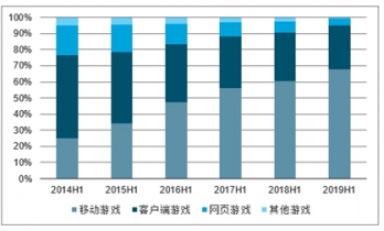 2019上半年,多款高品質(zhì)表現(xiàn)超出市場(chǎng)預(yù)期,如完美世界研發(fā)、騰訊代理的《完美世界》、騰訊的《龍族幻想》《跑跑卡丁車》、鷹角網(wǎng)絡(luò)的《明日方舟》等,優(yōu)質(zhì)產(chǎn)品的供給帶來(lái)了行業(yè)增速的明顯回暖,需求端表現(xiàn)出較強(qiáng)韌性。在新游版號(hào)逐漸緩解的情況下,2019年H1中國(guó)移動(dòng)游戲市場(chǎng)實(shí)現(xiàn)收入753.1億元,同比增長(zhǎng)18.8%,占比游戲市場(chǎng)總規(guī)模進(jìn)一步提高至67.6%,同比提高7.2個(gè)百分點(diǎn)。客戶端游戲市場(chǎng)實(shí)際銷售收入同比增長(zhǎng)2.3%至322.7億元,但市場(chǎng)同比份額略微下降至27.5%;網(wǎng)頁(yè)游戲、游戲機(jī)游戲以及單機(jī)游戲的市場(chǎng)份額則進(jìn)一步被壓縮。