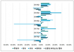 2017-2019年二季度中國(guó)汽車行業(yè)整體及子行業(yè)的經(jīng)營(yíng)性現(xiàn)金流/營(yíng)收占比變化情況