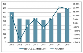 2011-2018年中國特鋼產品進口數量及同比增長走勢