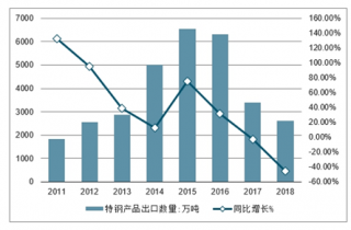 2011-2018年中國特鋼產品出口數量及同比增長走勢