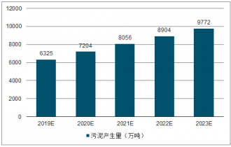 預(yù)計(jì)2019年我國(guó)污泥產(chǎn)生量將達(dá)到6325萬(wàn)噸,2020年我國(guó)污泥產(chǎn)生量將超7000萬(wàn)噸。2021年我國(guó)污泥產(chǎn)生量將突破8000萬(wàn)噸。未來(lái)五年(2019-2023)年均復(fù)合增長(zhǎng)率約為11.49%,并預(yù)測(cè)在2023年我國(guó)污泥產(chǎn)生量將達(dá)到9772萬(wàn)噸。