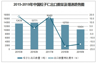 2015-2019年中國松子仁出口數量及增速趨勢圖