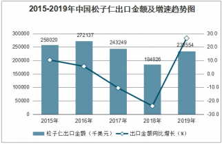 2015-2019年中國松子仁出口金額及增速趨勢圖