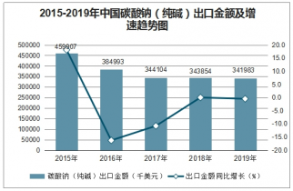 2015-2019年中國碳酸鈉(純堿)出口金額及增速趨勢圖