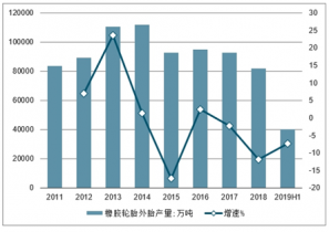 2011-2019年H1中國橡膠輪胎外胎產(chǎn)量及增長(zhǎng)情況