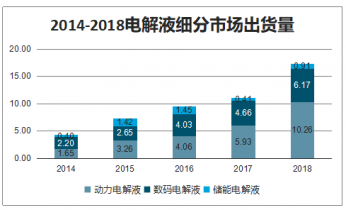 從國內電解液細分市場出貨量來看,在 2014-2018 年期間,動力電解液從 1.65 萬噸增長至 10.26 萬噸,復合增長率達 58%;數碼電解液從 2.2 萬噸增長至 6.17 萬噸,復合增長率為 29%;目前儲能電解液市場相對較小,處于萌芽期,由 0.4萬噸增長至 0.91 萬噸。從國內電解液細分市場占比來看,動力電解液占比從2014 年的 39%提升至 2018 年的 59%;數碼電解液占比從 52%下降至 46%;儲能電解液占比下降 4 個百分點至 5%。