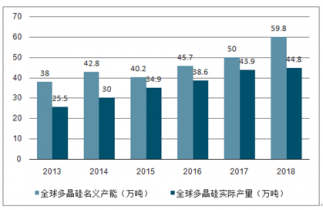 2013-2018年全球多晶硅產(chǎn)量及產(chǎn)能規(guī)模