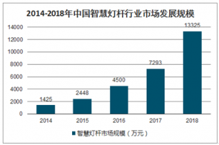 2014年我國智慧燈桿行業市場規模約1425萬元,到2018年增長到了13325萬元,近幾年我國智慧燈桿行業市場規模如下: