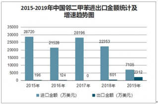 2015-2019年中國鄰二甲苯進出口金額統計及增速趨勢圖