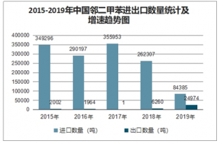 2015-2019年中國鄰二甲苯進出口數量統計及增速趨勢圖