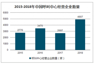 呼叫中心業務需求領域橫縱發展,推動了整個呼叫中心行業規模的不斷擴大。呼叫中心需求前景向好,企業規模增加。2015年國內呼叫中心經營規模企業數量已達2770家,截止到2018年底,國內呼叫中心中經營已成一定規模企業數量增長至約4907家。預計在各行業線上業務的進一步發展和普及的吸引下,呼叫中心行業入局企業將持續保持增長。