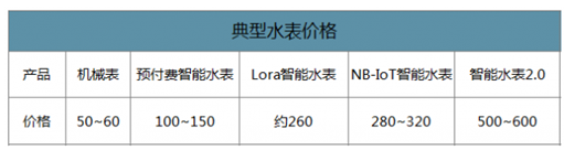 機械表價格穩(wěn)定于50~60元,IC卡預(yù)付費100~150元,Lora 260元, NB-IoT 280~320元,超聲波等智能水表2.0處于500~600元。