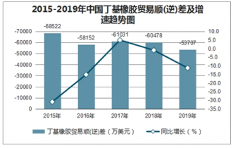2015-2019年中國(guó)丁基橡膠貿(mào)易順(逆)差及增速趨勢(shì)圖
